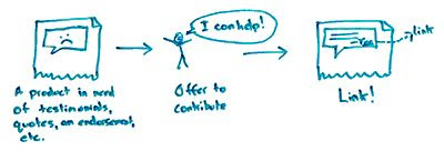 This is sort of a modified version of "I made this thing you'll probably like." But instead of saying, "Here's the thing that you will probably like and maybe include," you're saying, "I noticed that you have a product, a piece of content, a tool, a new piece of hardware, some physical product, whatever it is, and I like it and I use it and I happen to fit into the correct demographic that you are trying to reach. Therefore, I am happy to contribute an endorsement or a testimonial." Oftentimes, almost always, whenever there's a testimonial, you will get a link back to your source, because they'll want to say, "Well, Rand Fishkin from Moz says X and Y and Z," and there's the link to either my page or to Moz's page.